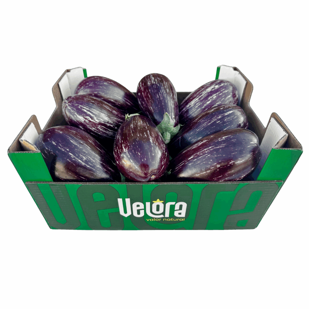 La berenjena rayada destaca por su piel brillante con franjas moradas y blancas, y una textura firme. Es seleccionada minuciosamente para asegurar que llegue a tu mesa en el punto ideal, aportando suavidad y un gusto delicado a tus platos.